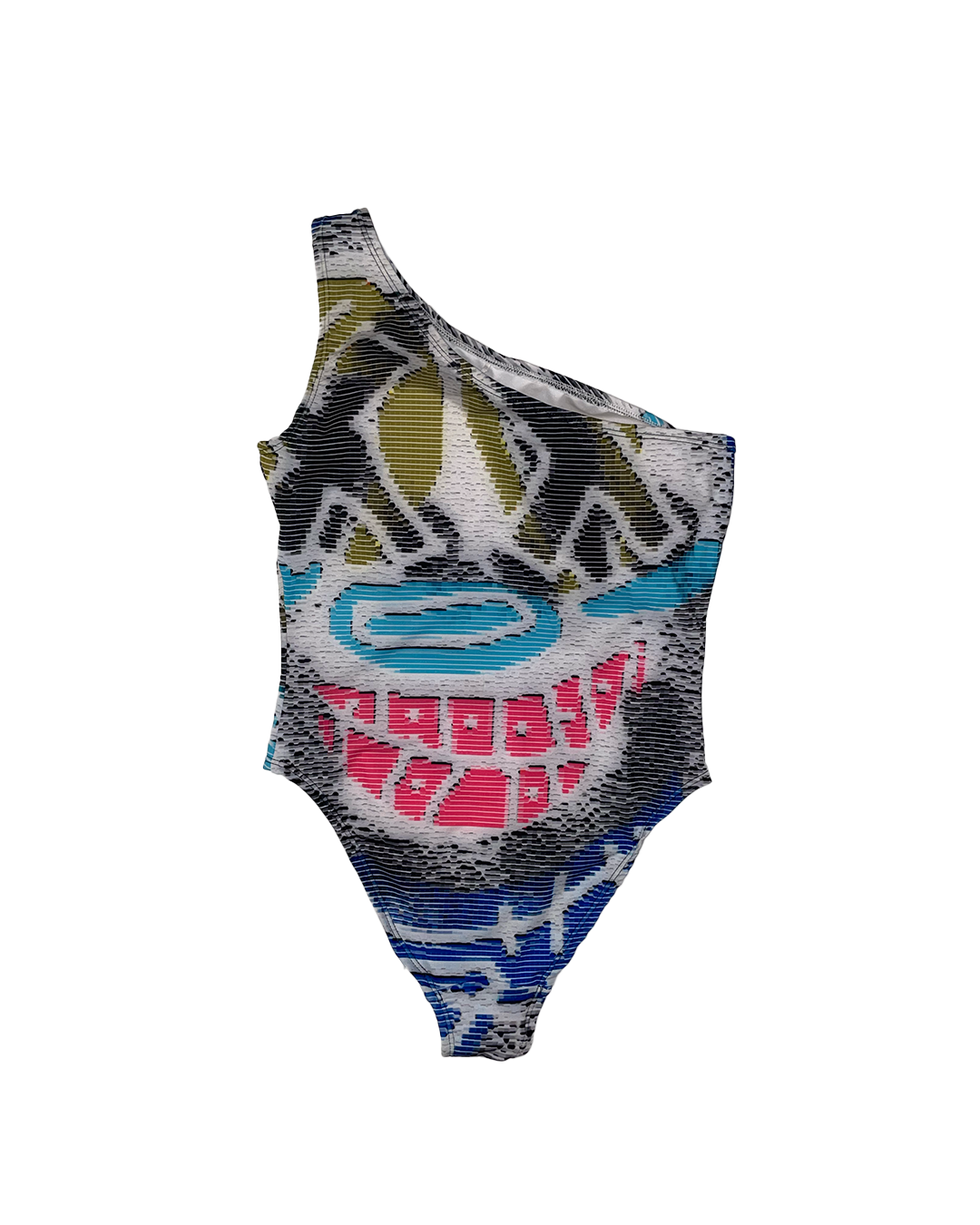 A twist on a simple one piece swimsuit to make it a one shoulder style.